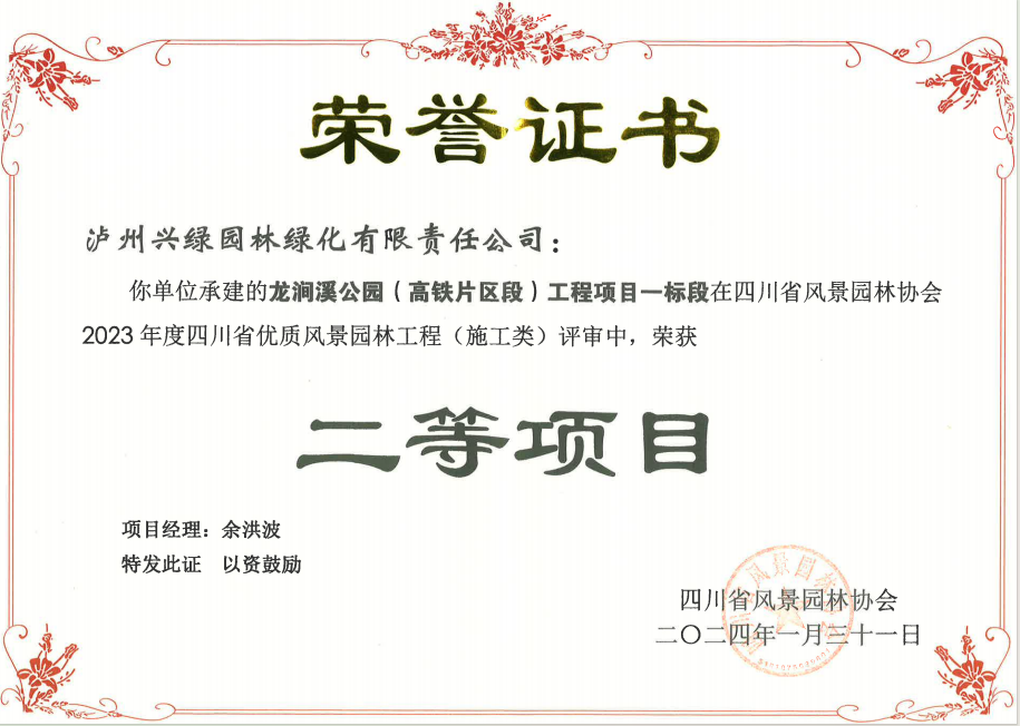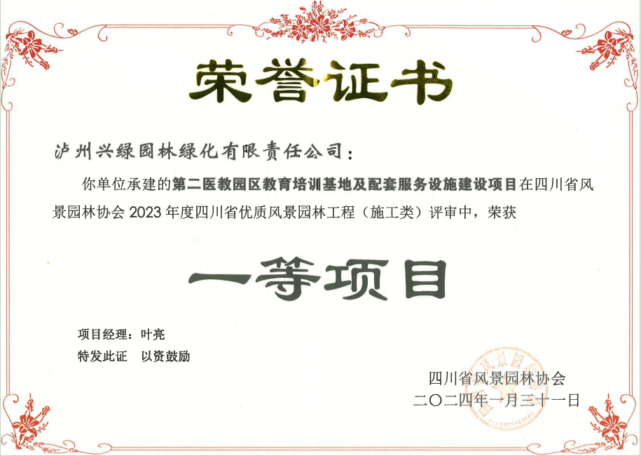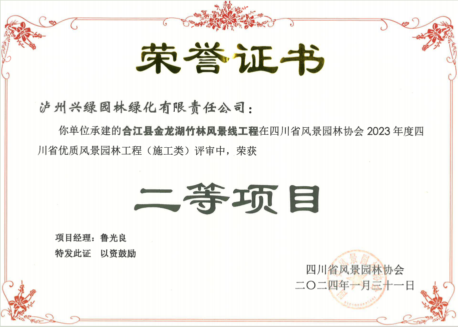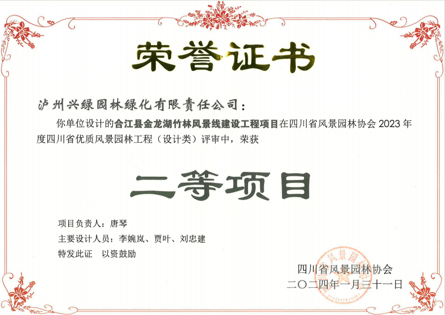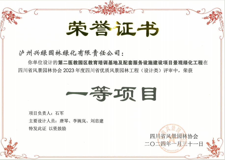 授奖仪式上兴绿园林公司3个项目喜获大奖,其中,承建项目“第二医教园区教育培训基地及配套服务设施建设”荣获2023年度四川省优质风景园林工程施工类一等项目、设计类一等项目;“合江县金龙湖竹林风景线工程”荣获2023年度四川省优质风景园林工程施工类二等项目、设计类二等项目;“龙涧溪公园(高铁片区段)工程项目一标段”荣获2023年度四川省优质风景园林工程施工类二等项目。